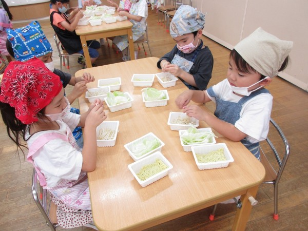 最初に野菜を千切ると、「ポキって音がする!」「もやしのにおい!」と音や感触を楽しんでいました。