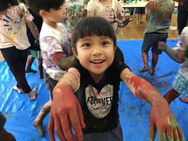 友達と手を繋いで色を混ぜ、次第に腕や足にも大胆に塗っていました!
